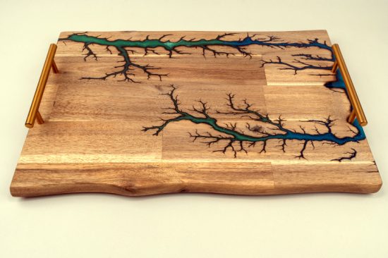 Les nuances marines Bleu/Vert du résine-art, évoquent les reflets scintillants de la mer. Notamment celle de la côte du Goëlo (qui s’étend de St Brieuc à l’île de Bréhat en Cotes d’Armor), créant un contraste saisissant avec la richesse du bois. Les motifs organiques et les couleurs vibrantes font de ce plateau, « Le Goëlo », un objet d’art à part entière, idéal pour sublimer vos moments de convivialité et d’élégance. La Finesse de la gravure électrique donne à ce plateau un effet foudre, un effet racines ou encore rivières.